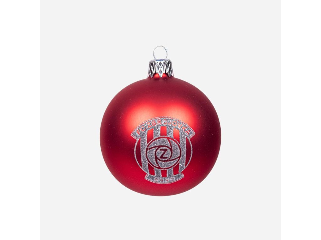 Skleněná vánoční ozdoba na stromeček červené barvy se stříbrným logem FC Zbrojokva Brno.